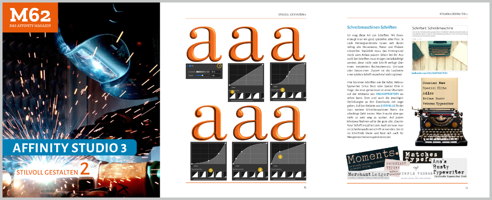 Mit dem Titel „Stilvoll gestalten 2“ ist nun ein weiteres M62-Heft in dieser Reihe erschienen. Lernen Sie, wie man Muster erstellt und mehrere von ihnen in einer Form, wie dem Grafiktext, platziert, jederzeit anpassbar über das Panel „Ebenen“. Im Photo-Studio lernen Sie, wie man „Lock-Up Tables (LUT) auf Fotos anwendet. Zudem habe ich einige Grundgedanken zu Geburtstags- und Hochzeitszeitungen verfasst und ich stelle Ihnen einige Schreibmaschinen-Schriften vor.