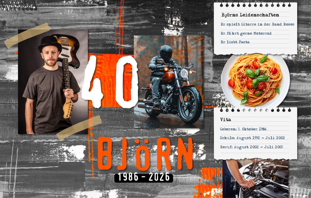 Bei dieser Arbeit kommen fünf Fotos und ein Asset zum Einsatz. Für dieses Magazin habe ich die Geschichte von Björn konstruiert und ihm einige Eigenschaften verliehen. So spielt er Gitarre, fährt Motorrad, liebt Pasta und wird 40 Jahre alt. Ein zusätzliches Bild dokumentiert seinen Beruf. Seine Daten werden mit Hilfe zweier Karteikarten aufgelistet, wobei ich bei der Schrift einen Schreibmaschinen-Font verwendet habe. Das macht die Szene rustikal und männlich. Rustikal ist auch der Hintergrund, wobei der Blickfang auf dem orangenen Viereck aufbaut. Dabei ist es fast logisch, die Jahreszahl in diesem Viereck zu platzieren. Die einzelnen Fotos wurden mit einem Schatten nach Außen versehen. Bei den Textinformationen auf der rechten Seite wurden einzelne Textrahmen verwendet, damit die Informationen auf die einzelnen Linien passen. Das war mit einem einzigen Textrahmen nicht zu machen, ohne den Zeilenabstand mühsam anzupassen. Für den Namen und die Jahreszahl wurde die Schrift „XBAND Rough“ verwendet, eine Grunge-Schrift mit der man unsaubere Texte setzen kann und die zum Thema passt.