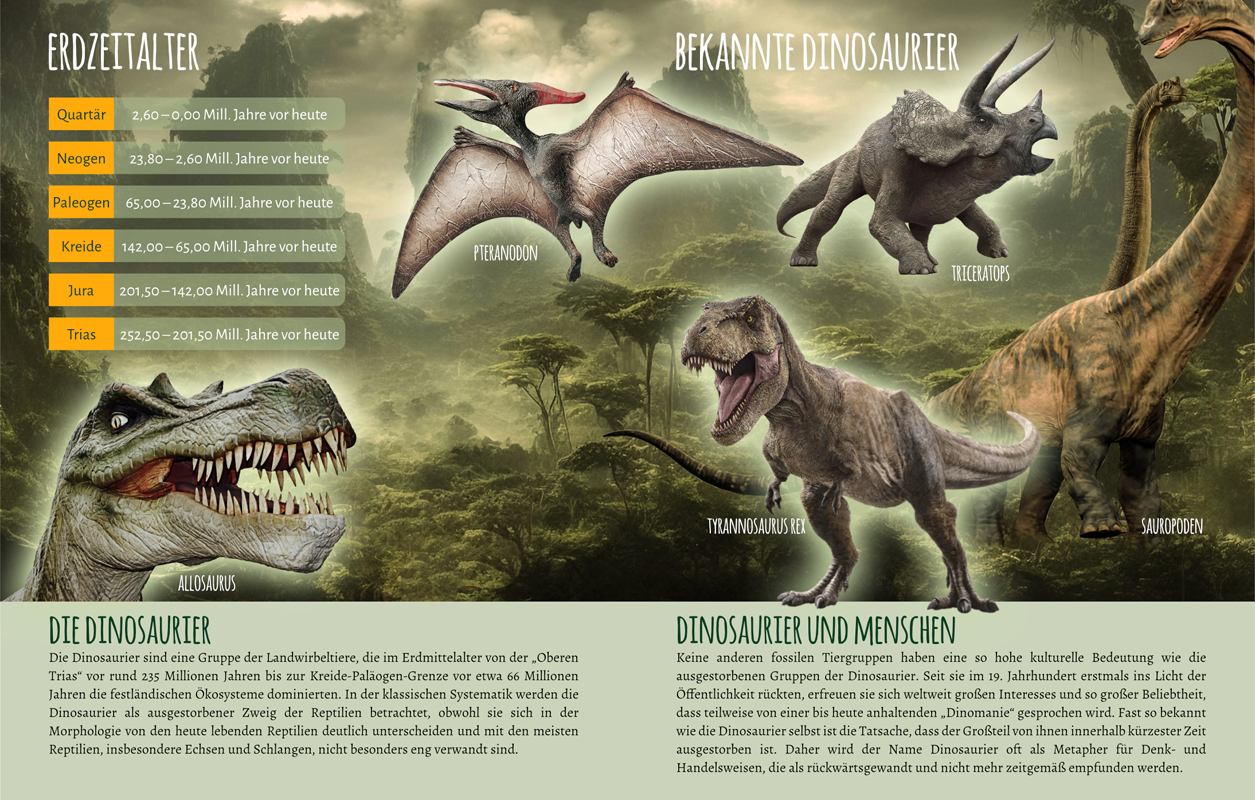 Bei dem Foto, das als Hintergrund dient, wurden im Pixel-Studio mit dem Stempelwerkzeug einige Bereiche unten links und oben links „weg-retuschiert“, damit sie „unter dem Kopf des großen Dinos“ und dem Vogel oben nicht stören. Alle vier Tierbilder liegen im PNG-Format vor, damit später der QuickFX-Effekt „Schein nach Außen“ angewendet werden kann. Das Foto des „Allosaurus“ musste horizontal gespiegelt werden, weil er sonst aus der Kollage „herausgeschaut“ hätte. Hier ideal mussten die Bilder farblich nicht angepasst werden, da sie alle in das „Konzept“ passten. Bei den vier Tieren wurde im Panel QuickFX ein „Schein nach Außen“ mit 100% gewählt. Da die Farbe Weiß etwas zu grell wirkte, wurde hier eine leicht grünliche Farbe (#A9B88C) verwendet. Diese Farbe wurde auch für den Textblock am unteren Rand verwendet. Über eine Suchanfrage im Browser landet man beim Begriff „Dinosaurier“ schnell bei Wikipedia. Zu Recherchezwecken reichen die Informationen hier völlig aus. Die Texte sollte man nicht eins zu eins übernehmen, denn sie passen oft nicht ins Layout. Hier sollte man kürzen, ohne den Kontext zu verwässern.