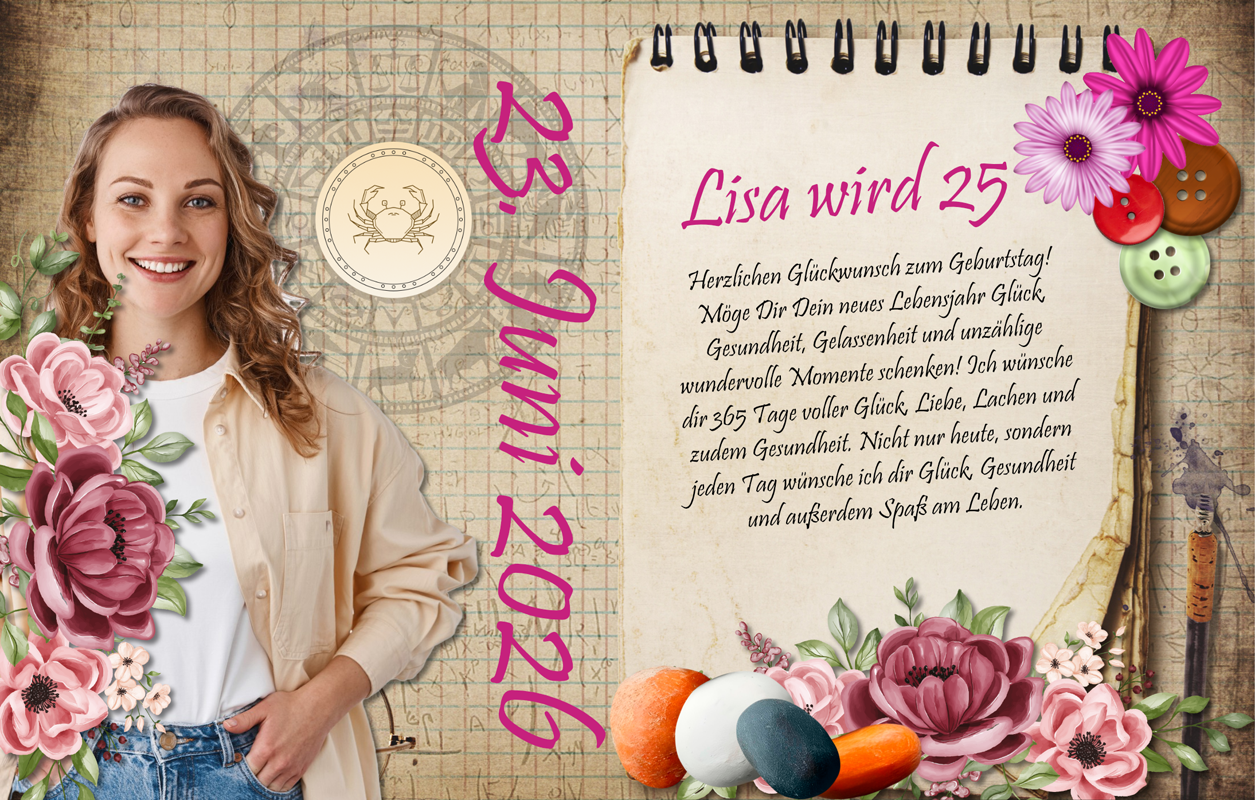 Lisa ist eine fiktive Person und ich muss zugeben, dass ich hier mit den Blumen, Knöpfen und Steinen etwas verspielt agiert habe. Es soll aber demonstrieren, dass man mit diesen Elementen durchaus einen verspielten Eindruck hinterlassen kann, wenn das gewünscht ist. Aufbauend auf den Hintergrund lag es nah, dass Lisa links und der Text zu ihrem Geburtstag rechts platziert wurde. Hier stellt sich auch die Frage, ob man sich erst alle Elemente zusammensucht und sich dann erst auf die Suche nach dem passenden Hintergrund macht. In diesem Fall war der Hintergrund zuerst da. Zum Thema Geburtstag kommen dann auch Grafiken für ein Sternzeichen in Betracht, wobei das Rad auf 16% Deckkraft zurückgesetzt wurde. Es soll im Layout nicht die Oberhand gewinnen, denn Lisa steht im Mittelpunkt dieser Ausarbeitung. Lisa selbst wurde als Grafik „freigestellt“, damit sie „aus dem Hintergrund hervortritt“.