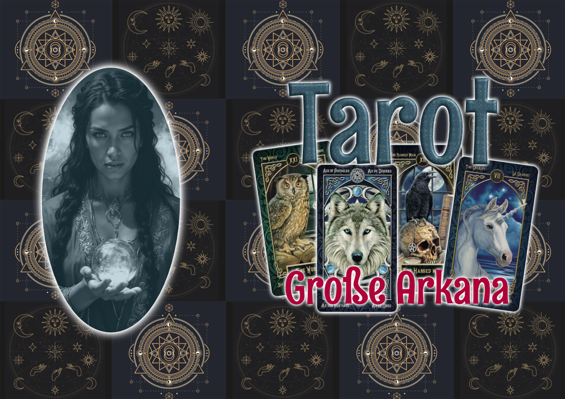 Bei dieser Arbeit wurden erst einmal einige Tarot-Karten eingescannt und dann freigestellt. Dabei wurde darauf geachtet, dass die Motive der Karten wirkungsvoll erscheinen. Die Tiermotive machen Eindruck. Für den Hintergrund wurden zwei Grafiken verwendet und so zugeschnitten, dass sie sich nahtlos vervielfältigen lassen, um ins Design (4 Reihen und 5 Spalten) zu passen. Beide Motive passen zum Thema. Bei der Frau links wurde ein farbiges Foto in Graustufen umgewandelt und über einen ellipsenförmigen Bilderrahmen eingefügt. Darüber wurde eine ovale Form mit der Farbe Blau gelegt und in der Deckkraft heruntergesetzt. So wirkt das Bild leicht bläulich. Die Schriftzüge rechts bestehen aus dem Font „Rum Raisin“. Das Wort „Tarot“ wurde zusätzlich mit einer Struktur versehen; mit dem Werkzeug „Füllung – Bitmap“. Zum Schluss bekamen alle Elemente über das Panel „QuickFX“ einen weißen Schein nach Außen. Dies war nötig, damit sich diese Elemente von dem dunklen Hintergrund absetzen.