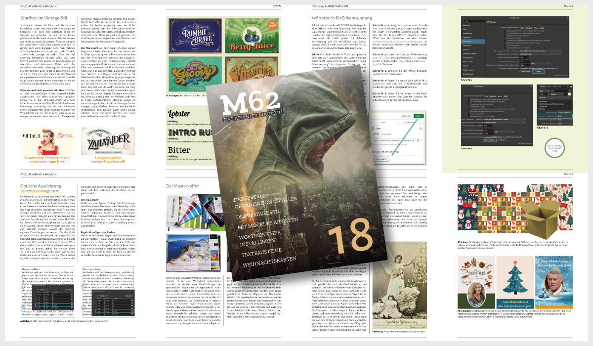 Schwerpunkt dieses Heftes ist das organisierte Arbeiten mit dem Affinity-Publisher, denn nichts ist schlimmer als eine unkontrollierte Fehlerkette in einem Projekt. Dann möchte ich das Drucken einer Broschüre auf dem eigenen Drucker beschreiben, wobei man einige Probleme vermeiden kann, wenn man nicht den eigenen Druckertreiber nutzt. Ich erkläre zudem, wie man ein Wörterbuch für die Silbentrennung installiert, dazu gibt es auch den Link zu einem Erklärvideo bei YouTube. Für den Vintage-Stil habe ich in der Vergangenheit schon einmal kleinere Projekte beschrieben, jetzt möchte ich Ihnen den Stil selbst einmal näher erläutern. Dann möchte ich kurz auf die optische Ausrichtung von Texten eingehen und Ihnen die Einstellungen näher bringen. Was ist eigentlich ein Mock-up? Ich erkläre es Ihnen, genauso wie die Möglichkeit, Textbausteine mit einem Textprogramm zu verwalten. Informationen zu Musterkoffern von Druckereien, zum Einsatz von Kapitelabschlussbildern und Weihnachtskarten runden den Inhalt des Heftes ab.