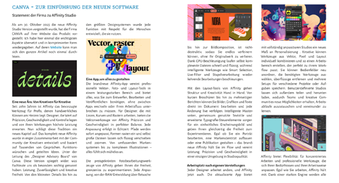 Eines vorweg! Die neue Affinity-Version macht Spaß, ist effektiv und vereint alle Funktionen der drei vorherigen Programme unter einem Dach. Die neue Software läuft nach ersten Versuchen sehr stabil. Während ich das Magazin mit dem neuen „Affinity-Studio“ setze, entwickelte sich nach und nach ein gewisses „Aha-Erlebnis“ im Umgang mit dieser neuen Version. In meinem aktuellen Magazin versuche ich auf die wesentlichen Eigenschaften der Software einzugehen. Das ist gar nicht so einfach, denn vieles hat sich geändert. Da man die APP kostenlos anbietet, sollte einem Umstieg nichts mehr im Wege stehen. Es lohnt sich!