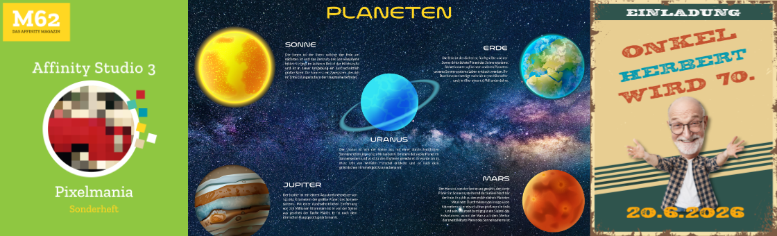 Am Anfang können Sie sich kurz über die wesentlichen Grundlagen informieren. Hier halte ich mich aber kurz, denn man sollte sich schon etwas auskennen. Richtig begeistert war ich vom „Filterpinsel“, meine Güte, was man damit alles machen kann. Sogar mein Lieblingseffekt ist dabei – das Malen mit Halbtonrastern. Interessant ist sicherlich auch das Malen in einer leeren Maske. Dann beschreibe ich einige „Bildstörungsfilter“, hier sind interessante Effekte möglich. In der aktuellen Affinity-Version ist die „Live Mischgruppe für Tonwerte“ hinzugekommen. Ich beschreibe, was damit möglich ist. Anhand eines Planeten-Beispiels beschreibe ich das Composing mit Freistellungsfunktionen, anhand einer Geburtstagskarte erkläre ich, wie man Hand in Hand mit allen drei Affinity-Programmen zusammenarbeiten kann. Und dann geht es um das KLONEN von Bildbereichen. Auch hier war ich richtig begeistert, was da mittlerweile möglich ist.