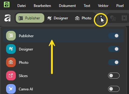 Nach dem Start des Programms findet man in Affinity Studio 3 oben links drei „Knöpfe“ mit denen man zwischen dem Designer (Vektor), Photo (Pixel) und Publisher (Layout) wechseln kann. Diese einzelnen Bereiche nennt man „Studios“. Wer gerne die alten Namen für diese „Knöpfe“ verwenden möchte, kann im Studio Manager (3 Punkte) nicht nur den Namen anpassen, sondern auch die Farbe und das Icon im „Knopf“. Dazu klickt man mit der linken Mouse-Taste auf die drei Punkte. Es öffnet sich ein Menü mit allen vorhandenen Studios. Nun wählt man den gewünschten Eintrag aus, indem man ihn mit der rechten Mouse-Taste anklickt und die „Bearbeiten-Funktion“ wählt.