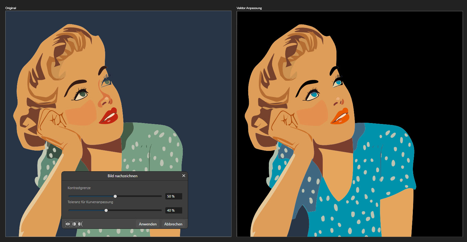 Über den Menüpunkt „Vektor – Bild nachzeichnen“ öffnet sich ein kleines Menü mit 2 Schiebereglern. Einmal für die „Kontrastgrenze“ und einmal für die „Toleranz für Kurvenanpassung“. Wenn man diese Regler verschiebt, sieht man im Motiv die Veränderungen der Regler-Einstellungen. Wenn alles passt, kann man das Ergebnis über „Anwenden“ bestätigen. Nun sollten im Panel „Ebenen“ die einzelnen Elemente sichtbar sein. Diese kann man jetzt bearbeiten. Ich denke, dass diese Funktion noch ausbaufähig ist.